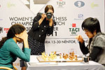 The sixth game of the Women's World Championship ended in time trouble. The Challenger Humpy Koneru was pressing in a basically equal position, but with time running out for both players is was the 17-year-old champion Hou Yifan who, in spite of a violent stomach-ache the night before, had the better nerves. With four games left she now has a commanding 4-2 lead.