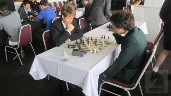 Board 2 close board [left] Mackinley He (Somerville Intermediate) vs Euan McDougall (Mt Roskill Intermediate)