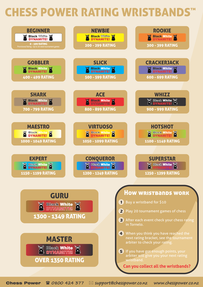 After your initial purchased wristband, as you get stronger and your rating improves, we will issue you new rating wristbands completely free of charge. There are 17 different coloured wristbands in total. Each colour represents a different rating group. Assuming you move through all rating groups, each wristband effectively costs you less than 60 cents! You can purchase rating wristbands at any Chess Power tournament.